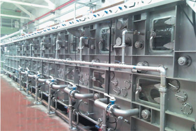 解決方案:機(jī)器密封,防止熱量散失;箱內(nèi)液體從后向前逆流,大大提高了水的利用率;轉(zhuǎn)鼓上方配有強(qiáng)力水刀式噴淋,每單元配有過濾箱裝置。