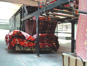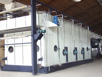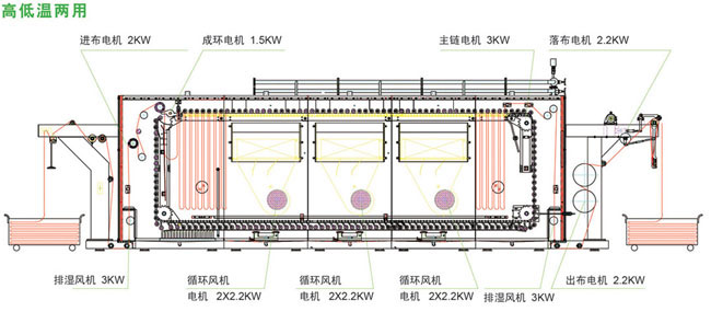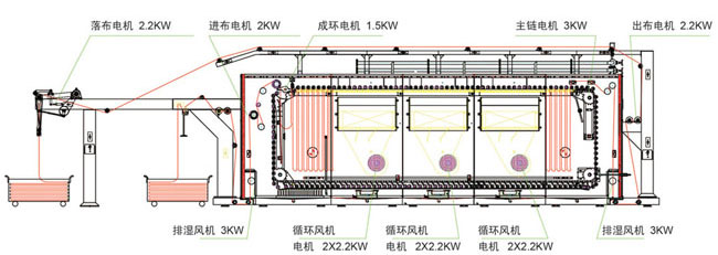 2、主蒸化箱體:主要包括進(jìn)布汽封箱、汽蒸箱頭段和汽蒸箱尾段以及若干個中段(每個中段容布量70m:兩個循環(huán)風(fēng)機(jī)、兩個熱交換器、兩套蒸汽加濕噴嘴等)、帶蒸汽加熱的頂部、底部輔助加熱管、帶照明的觀察窗、成環(huán)進(jìn)布輥、成環(huán)機(jī)構(gòu)、鏈條軌道、掛布輥軌道、掛布輥、主傳動、帶容布量探測器的出布調(diào)整裝置、出布汽封箱、離心排風(fēng)機(jī)等。