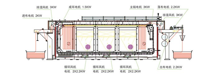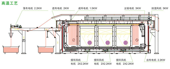 機(jī)器設(shè)計為下進(jìn)布、下出布,使多余的蒸汽及廢汽只能上而下溢出箱體,充分的利用了飽和蒸汽并節(jié)約用汽;比原上進(jìn)布節(jié)約用汽16.7%(原機(jī)型用量約1噸/小時-1.2噸/小時,現(xiàn)機(jī)型用量約0.8噸/小時-1噸/小時)。