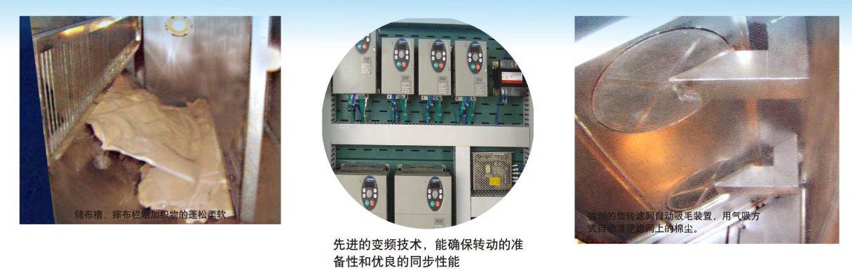 獨創(chuàng)的旋轉濾網(wǎng)自動吸毛裝置用氣吸方式自動清理濾網(wǎng)上的棉塵,連續(xù)不斷實時收集,保證了被處理織物的高效烘燥。