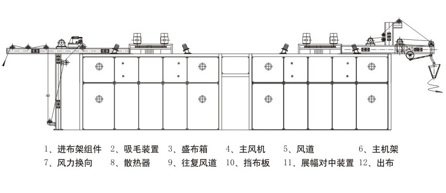 本機采用交替?zhèn)鬟_織物的原理,在噴射的熱氣流的推動下在風盒內往復運動并被拍打?椢锢w維正反向均衡吹拂,使織物毛圈得以充分豎立、蓬松,提高了手感,使織物達到較高的縮水值。儲布斗里容布使機內的容布量增加。織物在機內有充分的烘干時間,從而達到高效烘干的目的。